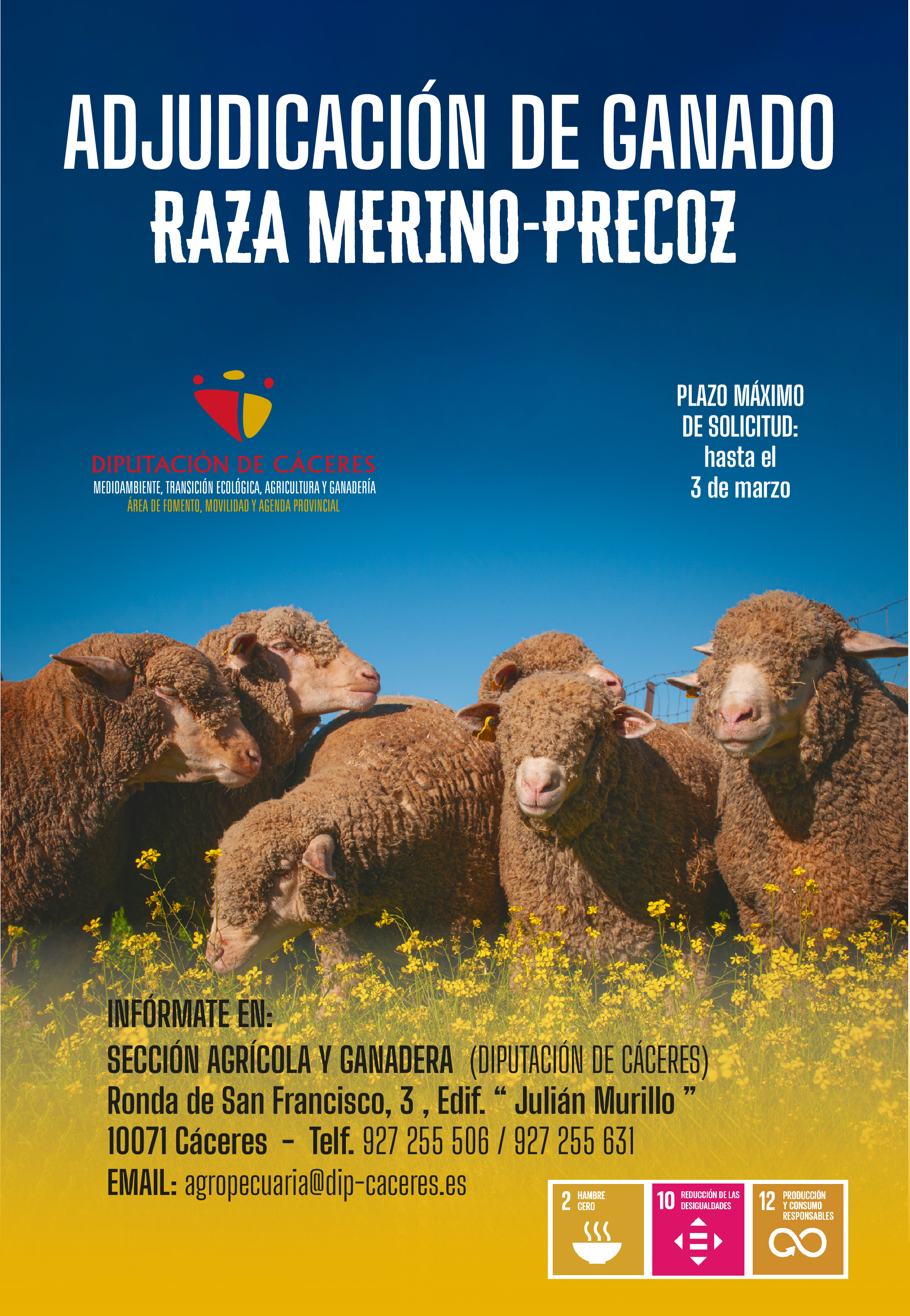 Buenos días, desde la Excma. Diputación de Cáceres se pone en conocimiento de las personas interesadas que está disponible la venta de ganado ovino Merino-Precoz para vida.